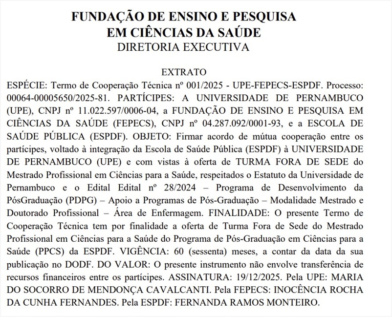 No mês de março tivemos dois importantes acontecimentos: a publicação da aprovação da proposta de Doutorado Profissional em Ciências para a Saúde (Portaria MEC nº 113, de 17 de fevereiro de 2025, publicada no DOU de 19/02/2025 – Link: https://www.in.gov.br/en/web/dou/-/portaria-mec-n-113-de-17-de-fevereiro-de-2025-613438676) e a publicação da autorização da migração do PPCS da FEPECS para a Escola de Saúde Pública do DF (Portaria MEC nº 210, de 14 de março de 2025, publicada no DOU de 18/03/2025Link: https://pesquisa.in.gov.br/imprensa/jsp/visualiza/index.jsp?data=18/03/2025&jornal=515&pagina=58&totalArquivos=196).